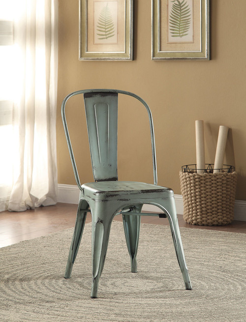 This set of four Bellevue chairs features metal construction for exceptional stability and longevity. The blue finish immediately catches the eye, while a rugged, distressed finish contributes to a distinctive industrial look that fits well within rustic or cottage-chic homes. Use these to create a dining set you can love and cherish for years to come.