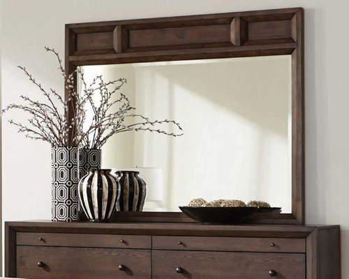 The Bingham Collection offers a modern take on a retro, mid-century design. Combining a brown oak finish with smooth, beveled-edged frames all situated on outward-angled legs to achieve the retro-modern look. This mirror, which sits on the Bingham Retro-Modern Brown Oak Six-Drawer Dresser, has an added feature of interest in the partitioned section on the upper frame. This mirror's large surface offers ample visibility you're sure to appreciate.