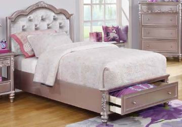 Designed with a whimsical style fit for fairytale royalty, this full-size bed from the Caroline Collection is worthy of becoming an instant focal point in any room. The metallic lilac finish glimmers in the light, with sparkles of rhinestone peeking out from the deep tufting of the upholstered headboard. In the base, a wide drawer offers plenty of storage room for items like luxurious comforters or extra linens.