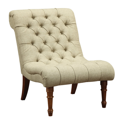 With its armless design, this casual piece offers an interesting take on accent chairs. The deep button tufting on the back and seat offer a traditional look to the upholstery. The light-brown legs contrast the mossy-green upholstery well, giving a warm feel to the chair.