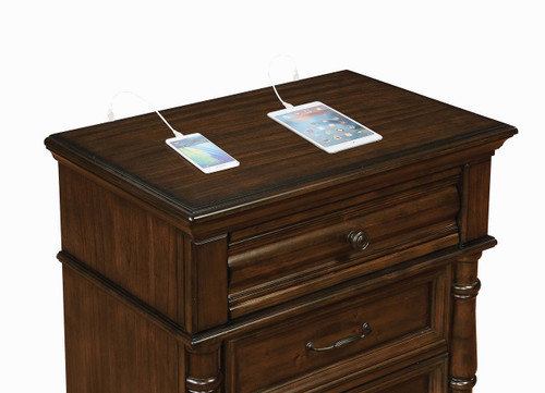 With its effortless blend of classic and modern styles, the Chandler Heirloom Brown Nightstand offers a versatile look to complement a variety of decors. Dual charging ports in the top drawer offer the ideal way to discreetly charge devices while the felt lining keeps electronics, jewelry, and keepsakes safely stored. Pair with other pieces in the collection for a cohesive, sophisticated look.