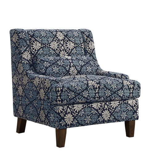 This beautiful accent chair from the Coltrane Collection showcases an engaging, floral-inspired pattern in indigo and cream that will serve as a tasteful complement to the Coltrane Collection's neutral-tone sofa and loveseat. The chair features sloping arms with a shortened back and thick seat cushion. Enjoy this chair's matching lumbar accent pillow and angled wood back legs.