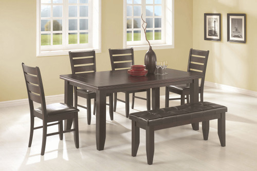 Large tapered legs are an eye-catching element of the Dalila dining collection. Found on each piece of this table and four side chair set, the legs set the stage for this casual design. The table's top features large planks and a straight edge, detailed with a thin, centered boarder. The chairs offer back support with horizontal slats paired with an upholstered seat cushion in a dark brown faux leather. Simple yet aesthetically pleasing, this dining set matches well with any decor.