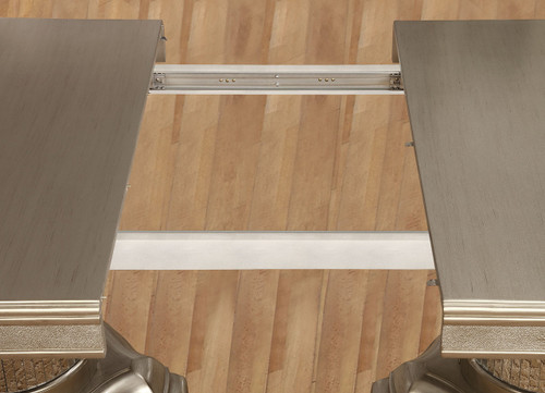 The Danette Collection is dramatic and emanates glam taste. Spacious seating and stunning mirrored table-base columns join together to create this unique dining table. Details in design are everywhere including the rounded table edges, decorated with mirrors matching the pedestal base. Tufting on the upholstered chair back is glammed up with the use of a clear diamond button. The chair's seat is wide, allowing the chair to stand well next to the large-scale Danette dining table. The exposed wood of this chair is finished in a metallic platinum and accented with a beveled border. This set includes the dining table and four side chairs.