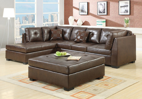 The bold and beautiful features of the Darie collection make this sectional a great addition to any casual living area. A fun design element is found in the single, large tufting of each of the loose back cushions. As a combination of a three-seat sofa and a chaise, there is plenty of space to stretch out and relax. A smooth brown faux leather adds warmth while high-resiliency foam cushions keep this sectional comfortable and inviting.