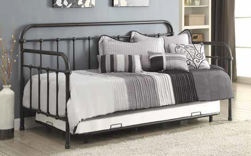 Industrial and chic were the inspirations for the design of this daybed. Constructed of strong metal tubing, this daybed is finished in dark bronze. The thick top frame brings a masculine look. The underbed trundle is included.