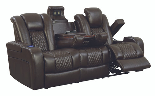 Kick your feet up with ease in this power motion reclining sofa from the Delangelo Collection. Upholstered in a brown breathable faux leather, this sofa features a quilt pattern on the seats and lower backs. This sofa is packed with several built-in gadgets, such as power headrests, hidden LED lights, cup holders, and pop-up wire management. Two reclining seats are available on this sofa so you don't have to fight for comfort! This sofa is also available in a black faux leather.