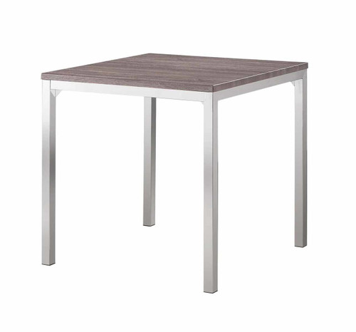 Quaint, compact, and quality-made, the Eldridge Weathered Grey and Chrome Counter-Height Table is a perfect fit for the contemporary home with a smaller dining space or breakfast nook. Built to fit two to four comfortably, this square, counter-height pub table's wood top is finished in a weathered grey that accentuates its natural grain. This pub table is a part of the Eldridge Contemporary Weathered Grey and Chrome Dining Collection, with full table, chairs and server available separately.