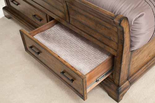 Charming farmhouse-inspired design gives the Elk Grove Collection a nostalgic aesthetic that can completely change the atmosphere of any bedroom. Each piece features solid wood construction with a gorgeous sense of visual weight, enhanced by a weathered antique finish for one-of-a-kind character. This four-piece set includes a nightstand, a paired dresser and mirror, and a California king bed with two drawers included in the base for even more storage potential.
