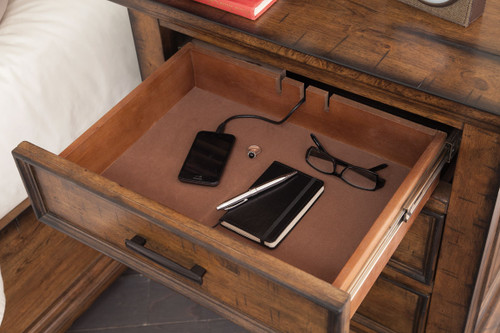 Evoke images of rustic cabins in your dreams tonight with this Elk Grove Rustic Three-Drawer Nightstand. Constructed from rough-sawn planks in a rich bourbon finish, this nightstand features power outlet cords in the top drawer to conveniently help recharge your digital devices. Subtle details in the wood drawer fronts and edges add character to this rustic piece.