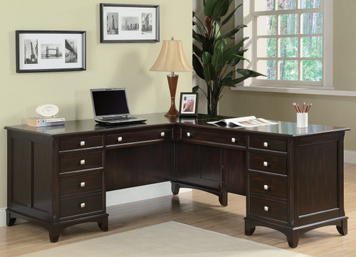 The Garson Collection offers a refined look for your home office. The left pedestal desk, one of two pieces that make up the Garson Transitional L-Shaped Desk, is finished in a rich cappuccino. Paired with clean lines and brushed nickel drawer pulls, the style is transitional. Four drawers plus a keyboard drawer offer ample storage space. The Garson Transitional Desk Return is sold separately.