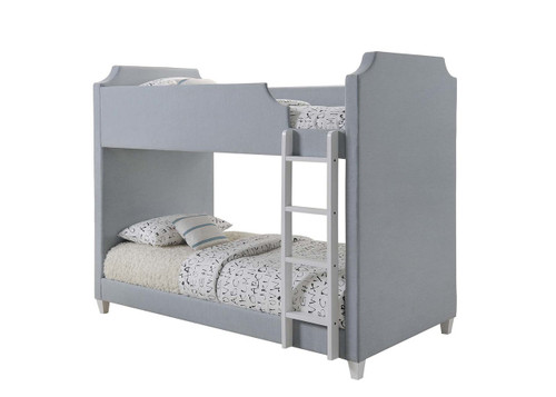 This bunk bed, designed in the traditional fashion, features a grey upholstery accented with a white wood ladder and feet. This twin-over-twin bed offers ample space for young children to sleep. With a tested 400 lbs static weight limit, these beds are sure to last. The slat kit comes included with the bed, and a bunkie board is not required.