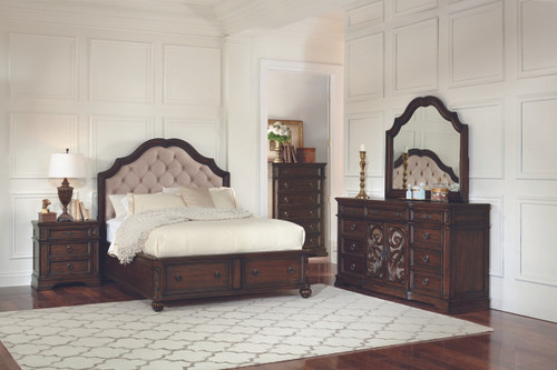 The gorgeous Ilana Collection makes a sophisticated statement with its intricate profiles, ornate decorative details, and rich java finish. Each piece offers something special the Eastern king storage bed features a plush upholstered headboard, the dresser includes breathtaking cabinet faces and a dramatic arched mirror, and the nightstand and chest of drawers draw the eye with stunning carved corners. This set makes a wonderful starting point for a fresh and refined bedroom redesign.