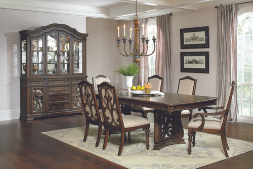 This traditional rectangular dining set takes elegance to the next level. Superior craftsmanship is found across all elements of the table, crafted from solid pine with sunburst veneer patterns within the pedestal and table edge. The beautiful antique java finish on the wood offers a vintage feel to the table, sure to be mistaken for a family heirloom. This dining set is perfect for entertaining guests as it is complete with four matching chairs featuring beige upholstered backs and detailed legs.