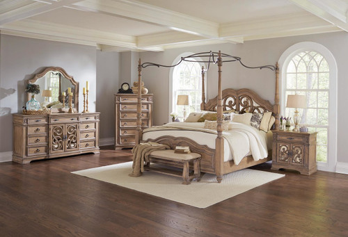 Bring an enchanting look to your room with a combination of wood, glass, and metal accents showcased in the Ilana Collection. Each piece showcases beautiful carvings in a warm, soft antique linen coloring. A mirrored back and wood scrollwork headboard on the poster bed, along with metal accents, make this set a wonderful selection for a warm look and feel to your space. Included in the set are a queen poster bed, nightstand, dresser, mirror, and chest.