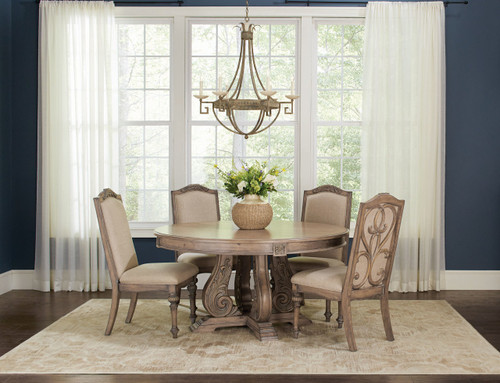 This traditional dining table set takes elegance to the next level. Superior craftsmanship is found across all elements of the table, crafted from solid pine with sunburst veneer patterns within the pedestal and table edge. The beautiful antique linen wood finish offers a vintage feel to the table, sure to be mistaken for a family heirloom. This dining set is perfect for entertaining guests as it is complete with four matching chairs featuring linen-upholstered backs and detailed legs.