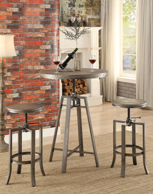 Strong confident lines add character to this industrial bar stool. Constructed from a metal base finished in a slate grey, this stool has a seat top with a wire brushed nutmeg wood finish. A corkscrew adjustable seat ensures you have the perfect seat at the bar.