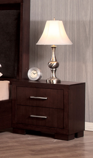 Keep all your nighttime essentials within easy reach on this two-drawer nightstand from the Jessica Collection. Crafted from solid wood and ash veneers in a rich cappuccino finish, this nightstand has silver-tone bar handles for an easy pull. Felt lining in the top drawer lets you safely store valuables and keepsakes. Add this contemporary bedside table to your master bedroom.