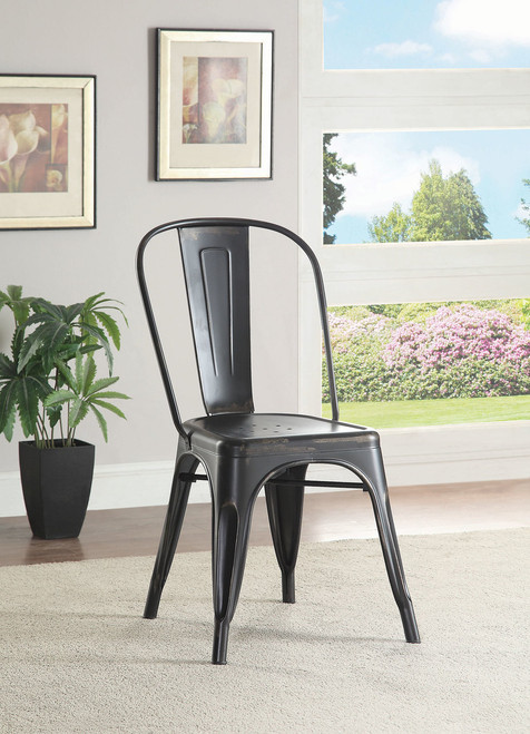 A slightly distressed texture gives this black dining chair a slightly rustic or industrial vibe that's great for modern and classic spaces alike. Metal construction ensures durability to withstand years of love and everyday use. Each set includes four chairs for a complete dining set.