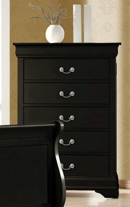 Classic style such as this Louis Philippe Black Five-Drawer Chest has no limitations. From it's five-drawer ample storage to the intricate wood detailing within its black finish, this chest stands out as a traditional piece for your wardrobe needs. Silver bail drawer handles complete the classic look.