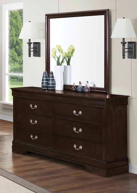 This Six-Drawer Dresser from the Louis Philippe Collection is sure to stand up to many years of sweater storage. Available in a cappuccino finish, this dresser is crafted from wood veneer and select hardwoods, with silver bail drawer handles. Delicate wood detailing at the top and base complete this traditional look.