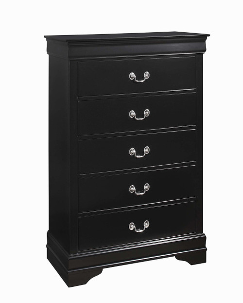 Add a traditional, distinguished look to your home with this stunning chest, featuring a classic Louis Philippe design with a rich black finish and polished silver hardware. Available in several finishes, this timeless piece will add ample storage and exceptional style to any bedroom. Pair with other pieces in the collection to enjoy a cohesive, sophisticated look for years to come.