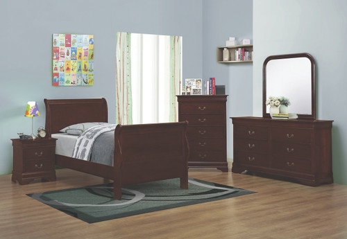 Finished in a rich red-brown, this traditional-style bedroom furniture from the Louis Philippe Collection offers a warm and welcoming personality sure to fit with any interior theme. Each piece features clean lines and classic hardware for timeless appeal. This set includes a twin-size sleigh bed, a dresser with coordinated mirror, a chest of drawers, and a nightstand everything you need to create an organized and comfortable atmosphere.