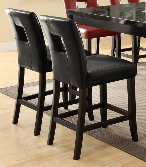The beautiful black faux leather this counter-height stool is upholstered in is crisp, stunning, yet neutral, which is perfect for matching with any existing décor. A square cutout of the back is unique and eye-pleasing. Four legs in a dark cappuccino finish lean toward a contemporary style, while the relaxed profile of the chair is casual.