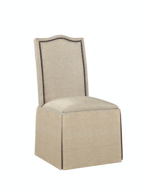 This upholstered parsons chair is designed with the formal dining room in mind. Upholstered in cool tan fabric accented with wood legs in a smooth, rustic amber finish, this chair exudes both comfort and class. For added style and formality, this chair is also adorned with a matching tan skirt to cover the chair's four legs. The chair's upholstered backing is accented with metal nailhead trim along the sides and top for an extra touch of detail. This chair is ideal used around the large dining table for hosting holiday events and family gatherings.