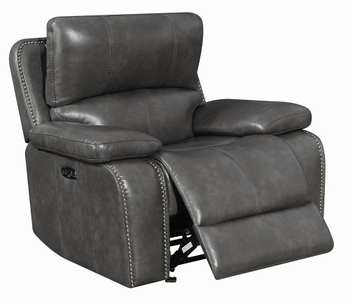 Add exceptional comfort to any room with this wall-hugging glider recliner, featuring a classic look in rich faux leather accented by chrome nailhead trim. This piece offers years of comfort with its power recline, durable spring construction, and memory-foam topper. To create a cohesive look, pair with other pieces in the collection and enjoy the unparalleled comfort of a quality-made piece.