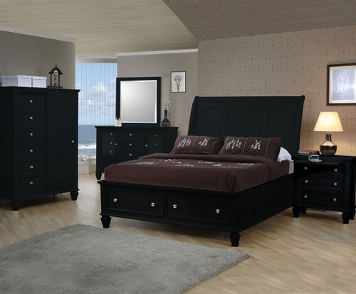 Dream of crashing ocean waves in this California king bed from the Sandy Beach Collection. Crafted from maple veneers in a black finish, this California king bed features two storage drawers at the foot of the bed. Crown moldings line every edge to finish the piece for a timeless, classic look. This bed is also available in cappuccino and white.