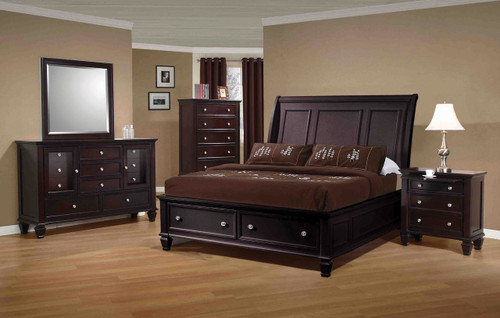 Dream of crashing ocean waves in this queen-size high-headboard bed from the Sandy Beach Collection bedroom set. Crafted from maple veneers in a cappuccino finish, this bedroom set features a queen bed with a high headboard and crown molding to accentuate the piece. This five-piece bedroom set also includes a nightstand, dresser, chest, and mirror. This collection is available in black and white.