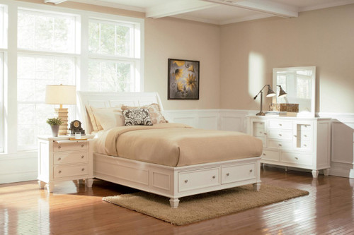 Dream of crashing ocean waves in this king-size high-headboard bed from the Sandy Beach Collection bedroom set. Crafted from maple veneers in a white finish, this bedroom set features a king bed with a high headboard and crown molding to accentuate the piece. This five-piece bedroom set also features a nightstand, dresser, chest, and mirror. This collection is also available in cappuccino and black.
