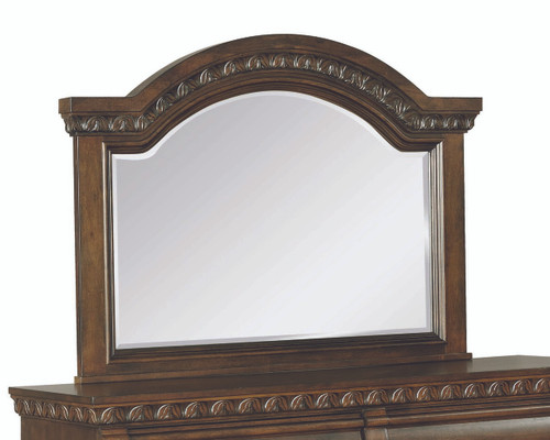 Don your Sunday best in front of this traditional dresser mirror from the Satterfield Collection. With an arched wood frame in a warm bourbon finish, this rectangular dresser mirror also features beautiful carving detail across the top. This mirror pairs perfectly with its matching dresser from the Satterfield Collection for an elegant look.
