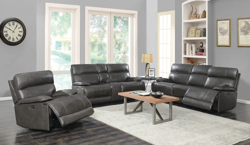 Use the included Bluetooth remote control to position this power sofa any way you like adjust the dual reclining seats and headrests to your liking with the press of a button. This sofa is upholstered in smooth charcoal faux leather over plush memory-foam padded seating. Pair with other pieces from the Stanford Collection for a fully coordinated living room set.