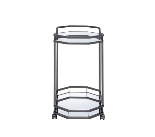 With plenty of space to hold wine bottles, glasses, and bar tools, this Traditional Black Nickel Serving Cart is ready to roll out and entertain. Enjoy this cart's long curved metal handle for easy movement and two spacious shelves, finished with mirrored bottoms.  Keep wine bottles upright and secure with this cart's metal wine holder on its lower shelf.