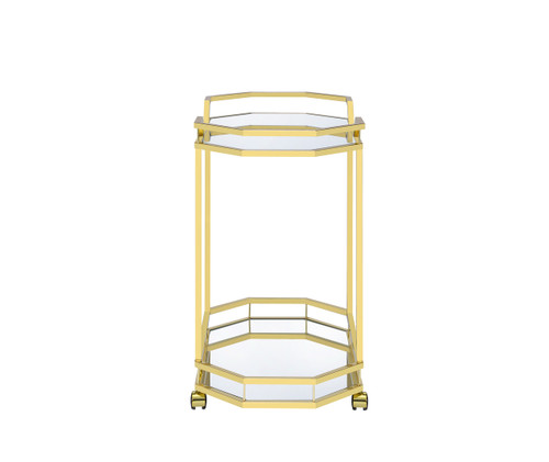 Serve up some great drinks for your guests on this rolling Traditional Brass Serving Cart. Constructed from steel and glass, this serving cart comes in a brass finish. This cart includes two tiers of shelving with guardrails and casters to move happy hour to wherever you need it!