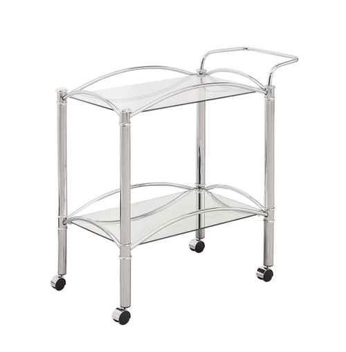Entertain and serve drinks in style with this chrome and glass serving cart. The cart's metal frame supports two glass shelves. The frame continues as a rail around each of the shelves. A beautiful design element is added in as the rail comes to a soft curve. A well-placed handle makes pushing this cart easy.
