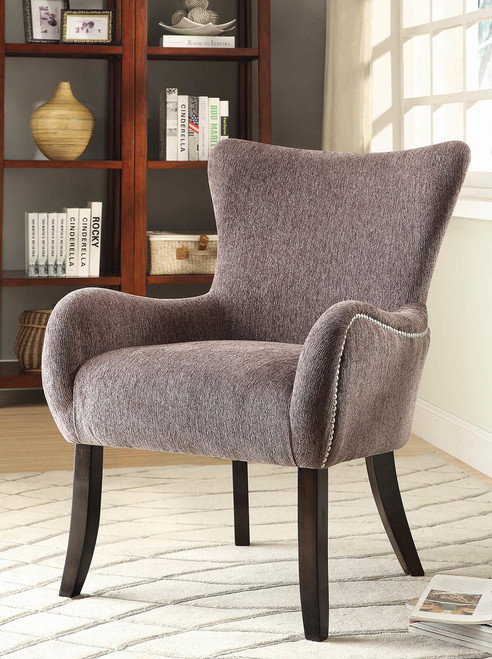 This chair features a curvaceous wingback style frame with smooth lines. The grey chenille upholstery covering the accent chair offers a comfortable option for you and your guests to sit. Accents such as decorative nailheads and espresso finished legs give a nice pop of color to the piece that works well with the fabric.