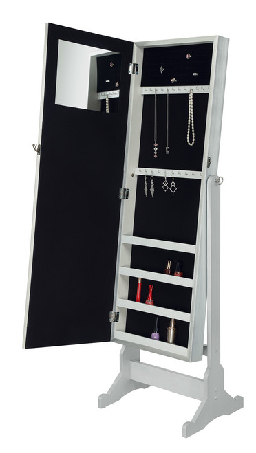 This cheval mirror brings traditional styling along with classic design elements. The full-length mirror has an ornate border, featuring crystal mosaic details. The adjustable swivel base allows you to position the mirror at your desired angle. Open the front of the mirror to reveal a large jewelry storage area. Complete with shelves and hooks, this armoire is perfect for hanging necklaces and bracelets. A bold black felt lines both sides of the jeweler armoire.