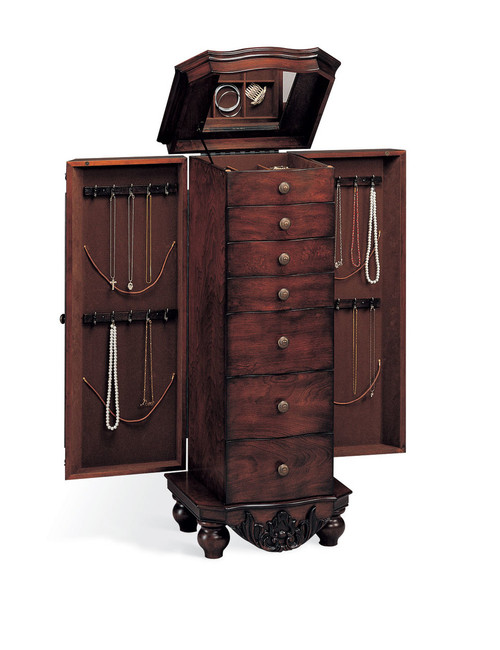 This slim jewelry cabinet offers plenty of storage in a beautifully designed and finished package. Featuring six storage drawers, two side doors perfect for necklaces, and a flip-top mirror, this cabinet has all the features you need in a jewelry station. The beautiful red-brown finish gives the piece an elegant look.