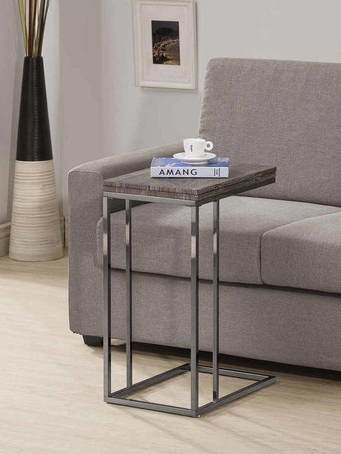 This practical snack table offers beauty and style in a functional piece. The wood top is finished in a weathered grey and folds open to expand the surface when more space is needed. The beautiful black nickel stand offers a great addition to the design, giving a sleek metallic shine to the piece.