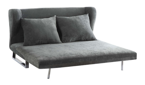 This sofa bed provides a unique way to entertain overnight house guests. This piece is upholstered in a grey velvet fabric for ultimate luxury, with electroplated chrome metal sled legs to complete the look. This versatile piece of furniture easily converts from a sofa to a chaise to a queen sized bed. Two accent pillows are also included in this piece for a cozy place to lay your head.