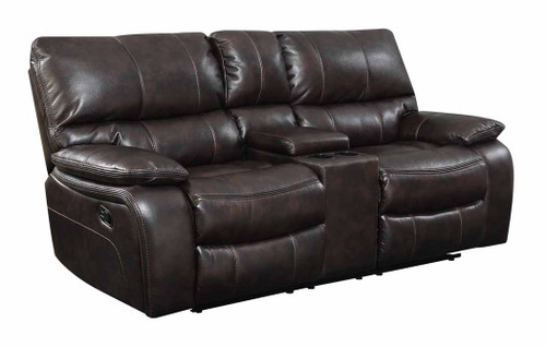 Hang out with friends and family on this chocolate reclining loveseat from the Willemse Collection. Upholstered in chocolate leather with accent stitching and extra-thick welting, this loveseat features a convenient drink holder and storage option in the center console. LED lights and outlets can also be found in the storage compartment for easy access. There will be no need to get up from this gorgeous loveseat.