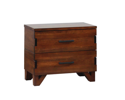 The design of this Yorkshire Two-Drawer Nightstand is the perfect blend of contemporary and rustic styles. Made from poplar wood and veneer in a dark amber finish, this nightstand features exposed finger joints on the drawer fronts. Charging access in the nightstand provides easy access to charge digital devices, and black felt lining in top drawers gives a place to store delicate items and a nice contrast to the wood piece. Pair this piece with some modern accessories for a contemporary blend of style.